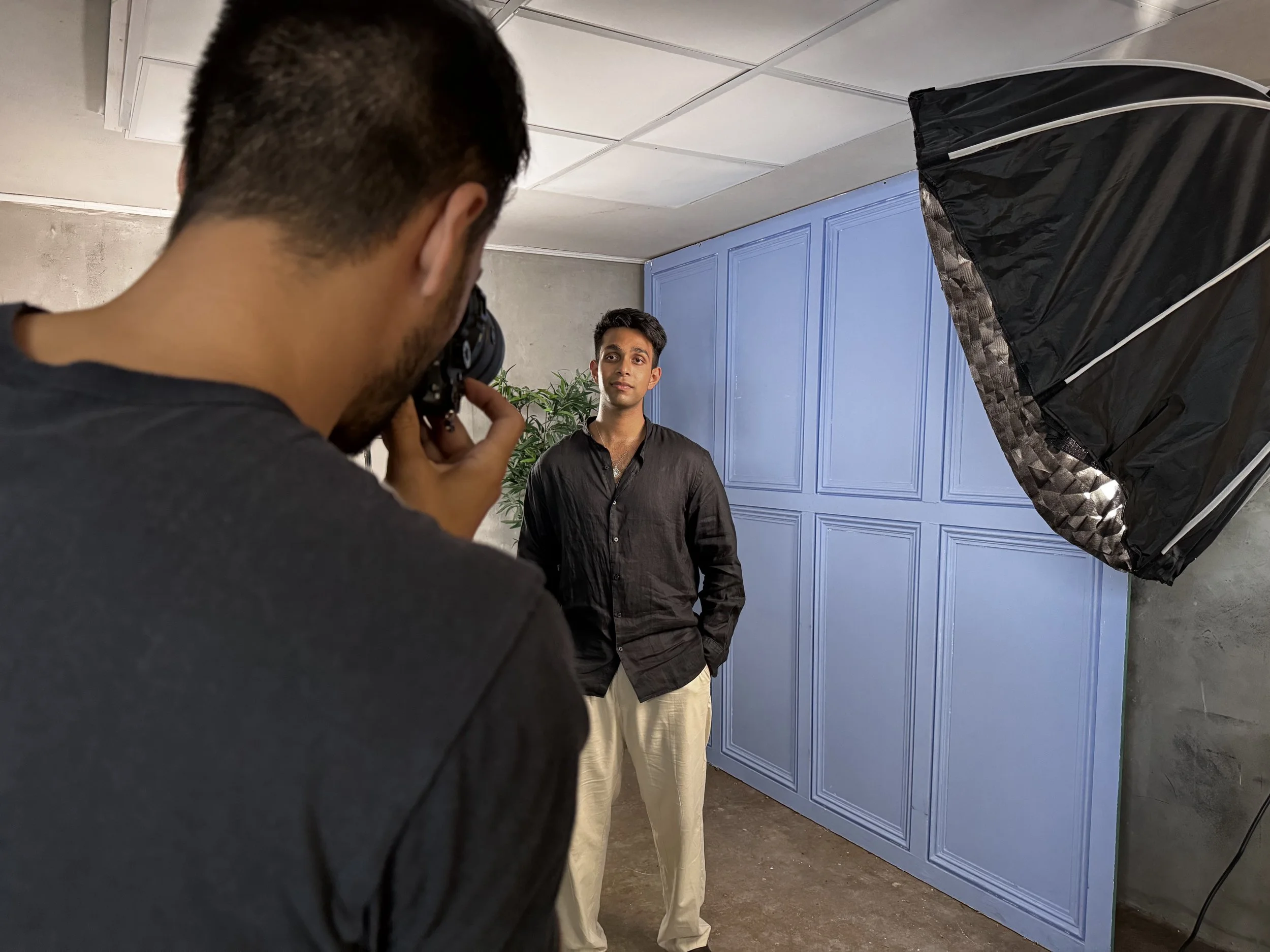 A man in black shirt stands in front of a blue paneled wall during a photo shoot, while the photographer in black shirt takes his picture inside a studio with a large professional light reflector nearby.