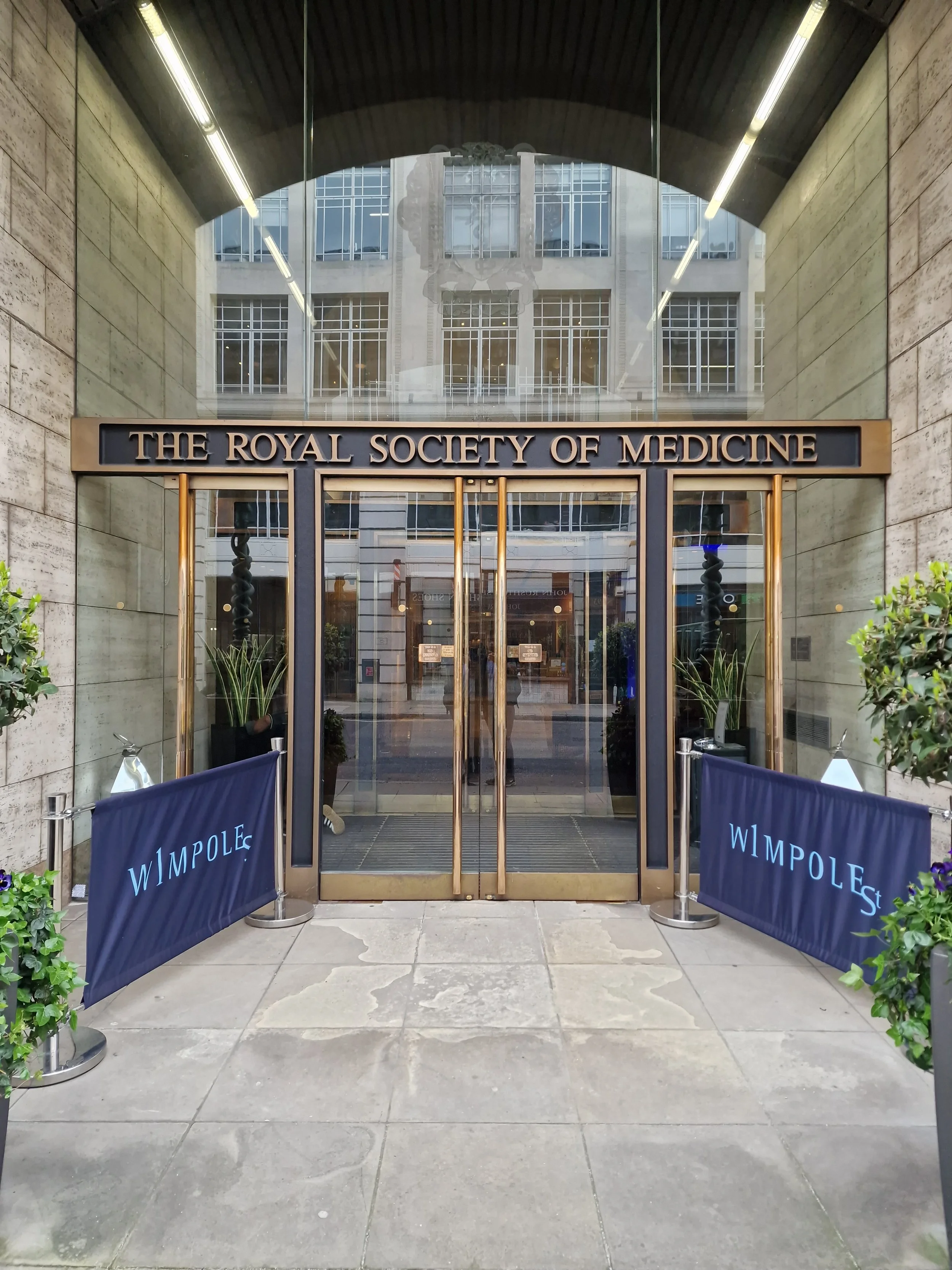 Entrance to the Royal Society of Medicine with glass doors, gold framing, and black sign with gold lettering, flanked by potted plants and blue barricades with the word WIMPOLË.
